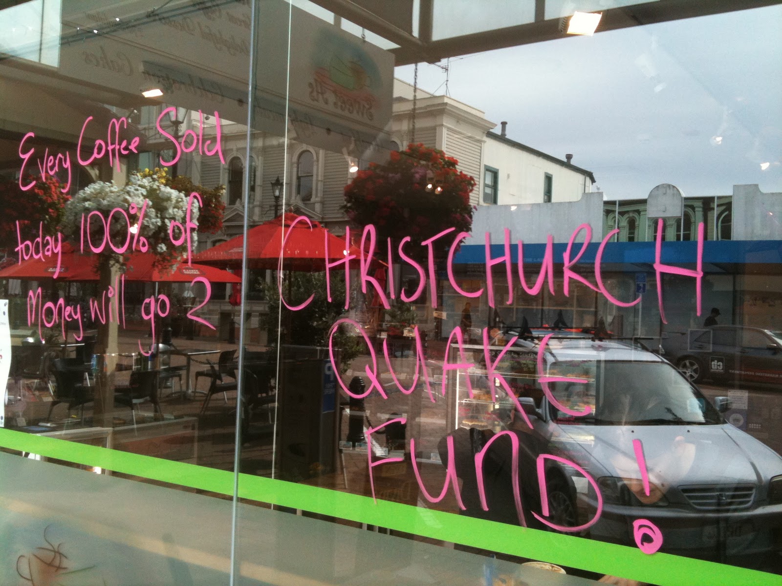 Local cafe donating their entire coffee revenue – not profit, REVENUE – for the day to the Christchurch Earthquake Fund.