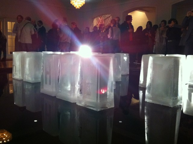 Last night, the sculptures were still large blocks of ice, enclosing objects at their core.