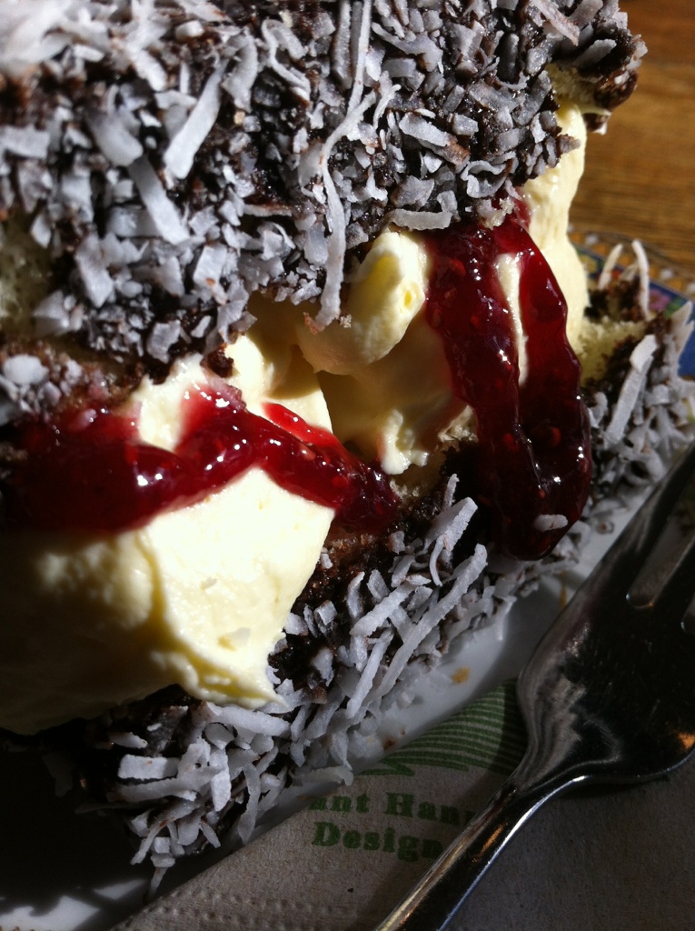 Looks like coconut, ice cream, chocolate, and cherry sauce? Am I right or close??